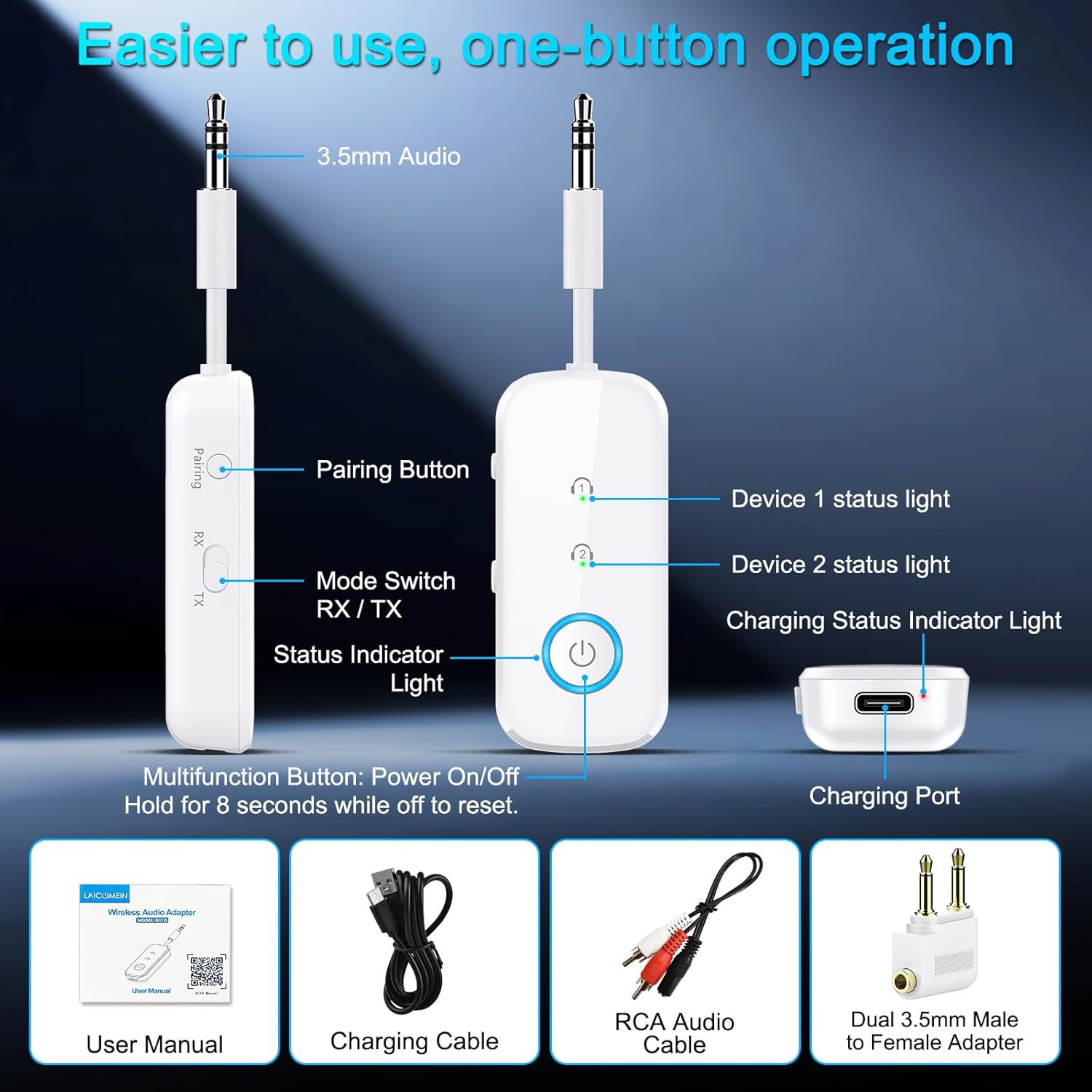 So I don’t usually write long reviews, but after spending some quality time with the Laicomein B110 Bluetooth transmitter/receiver, I felt like it deserved more than just a few quick lines. I actually received this unit directly from the manufacturer, and I’ve been using it consistently for a few weeks now across a bunch of different setups — and honestly, it’s kind of shocked me how well it’s performed.Right out of the box, I could tell this wasn’t going to be some generic throwaway gadget. Setup was super quick — I didn’t even need to glance at the instructions (though they are there and clear if you do need them). It paired instantly with my Bluetooth headphones, and I had it hooked up to my TV and my older stereo system within minutes. The process felt effortless, and I appreciated how intuitive the controls were, especially switching between transmitter (TX) and receiver (RX) modes with a simple toggle.What impressed me most, though, is just how solid and consistent the audio quality has been. When I use it in TX mode — mainly to stream audio from my TV to wireless headphones — the connection is strong and the sound is clean, with no weird distortion or crackling that I’ve had from other cheaper devices in the past. More importantly, the latency is barely noticeable, even while watching movies or gaming. That was a huge plus for me because I can’t stand when the sound doesn’t match up with people’s lips or game audio lags behind the action.I’ve also been using it in RX mode, especially in the car. I drive an older vehicle that doesn’t have built-in Bluetooth, so being able to connect my phone wirelessly and stream music or take calls has been a total game-changer. Again, no issues at all with connection stability or quality. Calls sound clear, music plays smoothly, and I love not having to mess with any cords.Another thing I really love is how portable this thing is. It’s compact enough to toss in a bag or even a jacket pocket, and the design is sleek without being overly fragile. I’ve brought it with me while traveling and even used it in hotel rooms to get better audio through portable speakers. The battery life has held up great — I’ve gotten several hours of continuous use on one charge, and I haven’t found myself needing to recharge it constantly, even with regular use. That’s a win in my book.Also worth mentioning: the dual input/output support is fantastic. It works with both 3.5mm AUX and RCA cables, which makes it super flexible depending on the gear you’re working with. I’ve used it on an older stereo with RCA inputs, my laptop with AUX, and a Bluetooth speaker — all worked seamlessly.So overall, if you’re on the fence about this little device, I’d say go for it. Whether you’re trying to modernize an old stereo, add Bluetooth to your car, stream wirelessly from your TV, or just have a flexible, go-anywhere transmitter/receiver, the Laicomein B110 really delivers. It’s compact, versatile, reliable, and surprisingly powerful for the size and price. I didn’t expect to get this much value out of it, but I’m genuinely impressed.Highly recommend it — especially if you’re like me and appreciate simple devices that just work right out of the box with minimal fuss.
